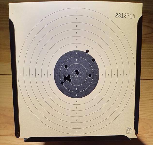 Pongo más abajo un blanco de 11 tiros (el primero es el que está fuera del negro y fué un tiro a la virulé que hice antes). Parece que lo de no salirse del negro (cachondeo aparte) es sencillo pues la tirada la hice con gafas de calle, a dos ojos abiertos y con no demasiada luz. Con diopter en las gafas podría ver mejor las luces de las miras y precisar más, considero que para estar tirada a la virulé no es un mal blanco (ver grupo de 4 en el nueve a las 8, los dos dieces son de propina)