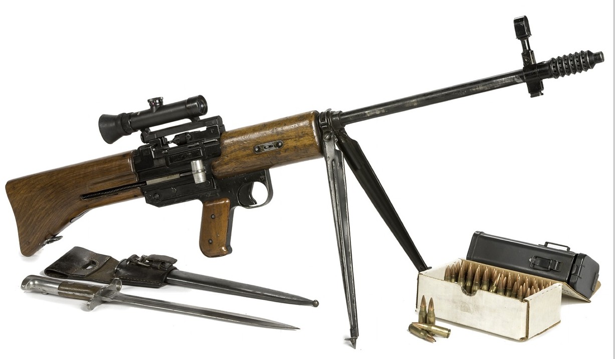 Esta es una ametralladora ligera suiza STG 51 en calibre 7,5 mm corto con un cargador lateral de 30 cartuchos.