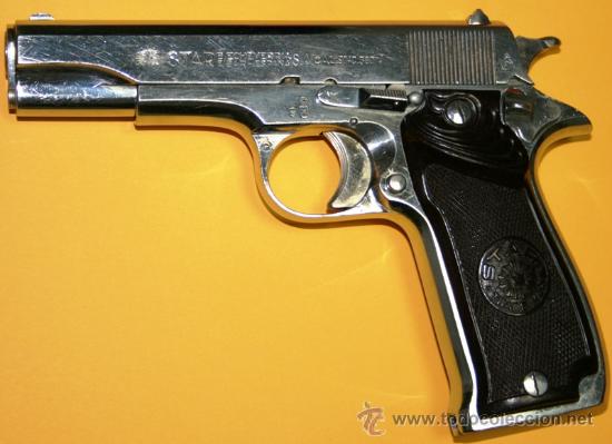 Fué un arma bonita, ligera, apreciada y fiable a ultranza, de la cual existieron 3 modelos: El primero (que os muestro a continuación y toda una mini-1911), Star S, la Star Super S, con el brocal del cargador ya atolvado, y la Super B, con ausencia de la cadeneta del cañón y quedando la doble palanca de retenida fija en el armazón, y el brocal del cargador atolvado.