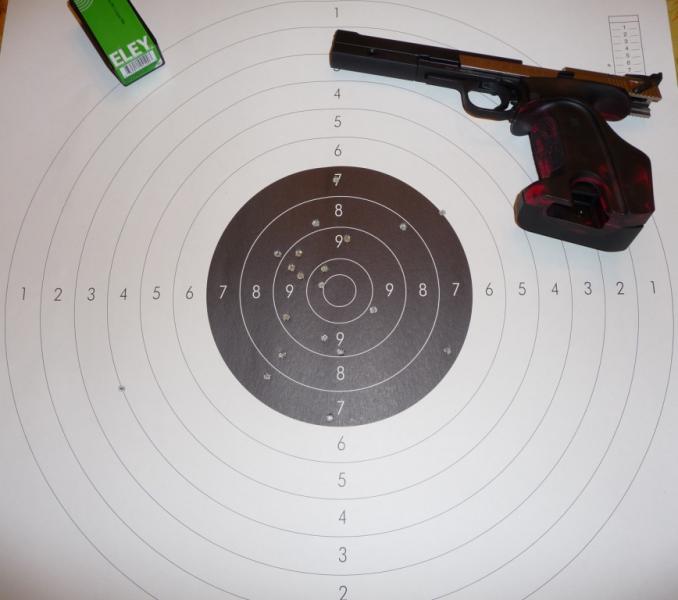 Respecto a la agrupación de la Hammerli no te sabría decir bien, ya que soy bastante inexperto en tiro con pistola y posiblemente con la mejor pistola del mundo no metiera 30 tiros en un radio menor de 50 cm.