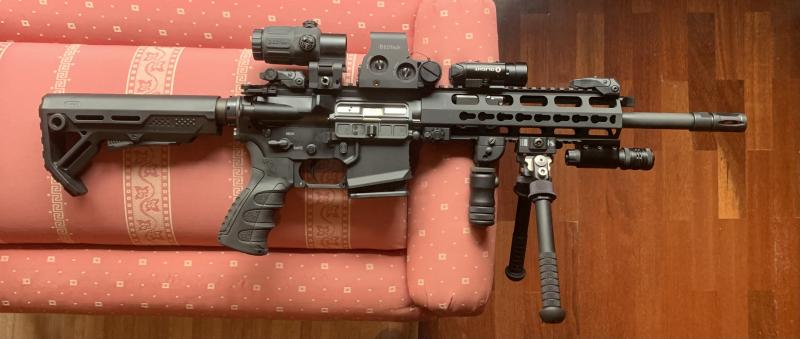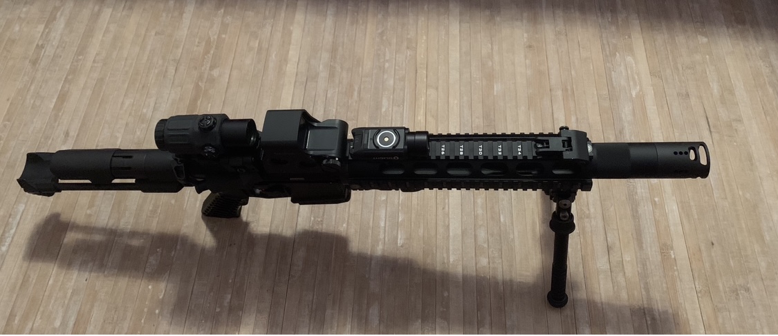 -Elementos de serie retirados: Culata Schweizer Waffen Technik (SWT); muelle+buffer; palanca de cierre; pistolet SWT, primero, y grips de goma y madera de sustitución, después; disparador; seguro; liberador de cargador; guardamanos KeyMod SWT; y freno de boca SWT.