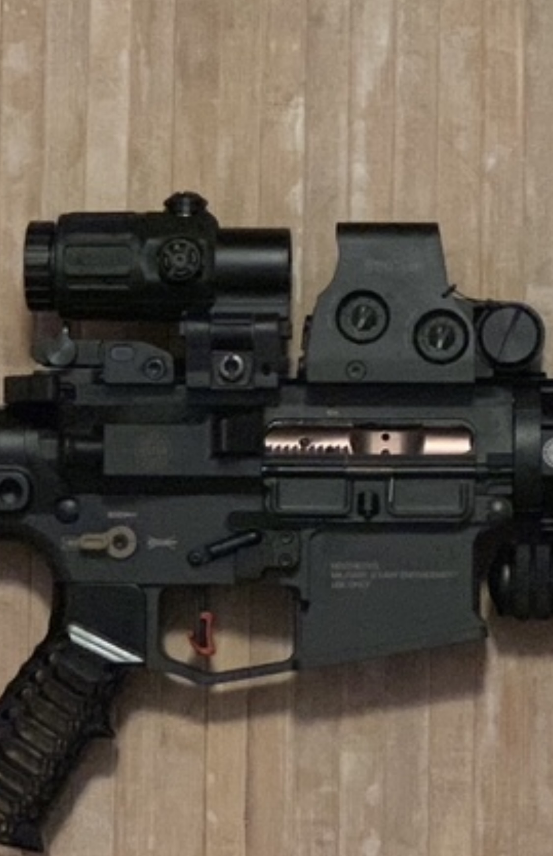 -Se instaló un bolt carrier JP Enterprises Low Mass, en acero inoxidable pulido a espejo, que fue devuelto por no funcionar del todo bien con la culata retráctil Strike provista del buffer de muelle guiado citado en el punto anterior. En la actualidad lleva un cierre recubierto de nitruro de titanio en color cobre que opera perfectamente (foto adjunta).
