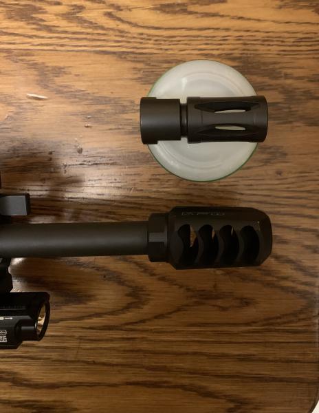 -Freno de boca modelo Raptor de cuatro puertos, fabricado por la empresa sudafricana Axis Precision Work (APW), en sustitución del original.
