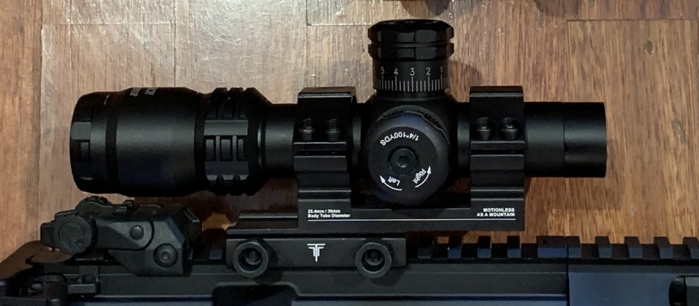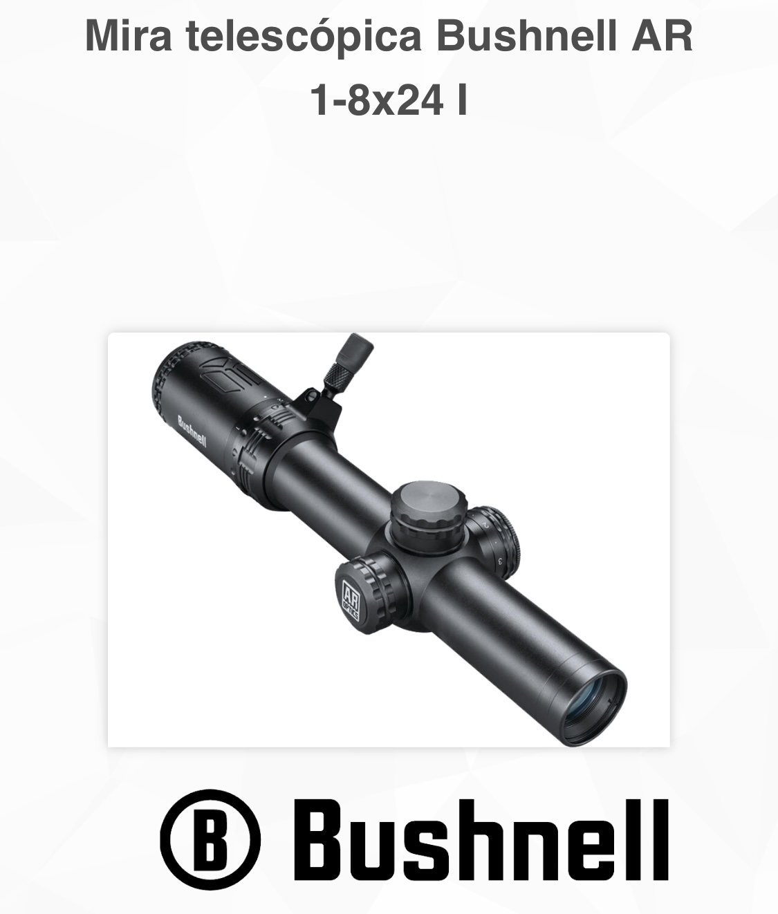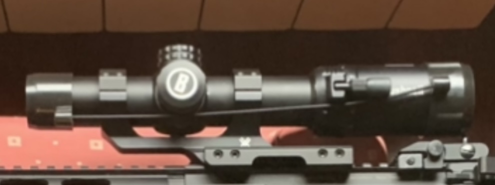 -Visor de back up March de 2-8x SFP y 1/4 de pulgada por click a 100 mts. De sólo 17,5 cm de largo, está pensado para M4s de 14” de cañón o menos. Segundo visor de back up Bushnell AR 1-8x24 SFP con tubo de 30 mm, retícula iluminada BTR1 en segundo plano focal y 26 cm de longitud. Un click = 1/10 de miliradian (1 cm). Base cantilever con burbuja de canteo horizontal e inclinómetro.