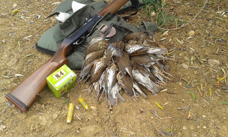 -Cupo de zorzales hecho hasta las 11 de la mañana. Cazados con semiautomatica Benelli modelo 201 del calibre 20, cartuchos marca italiana Romana Munizione modelo S4 de 53 euros los 250 cartuchos, de 25 gramos y plomo del 9 y una estrella de choke. Tiros larguisimos y caian fulminados, mejor que con la del calibre 12.-