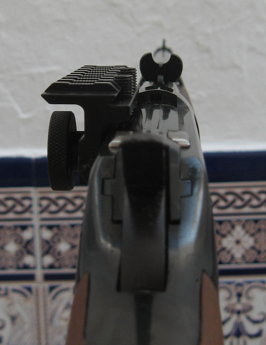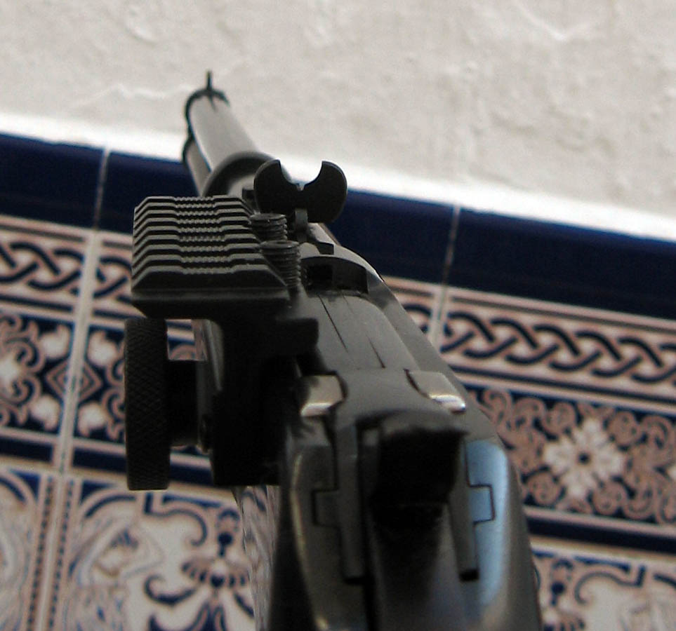 Ahora unas fotos del encare con el arma. El visor queda despalazado a la izquierda con respecto al eje del cañón, además de más elevado, claro. Supongo que esto hará que el ajuste del disparo a varias distancias sea complicado y que su utilidad práctica sea para las distancias cortas con un punto rojo, para tiro rápido.