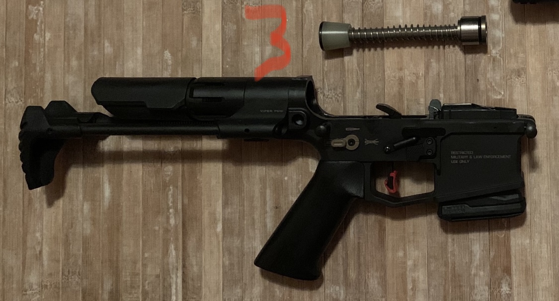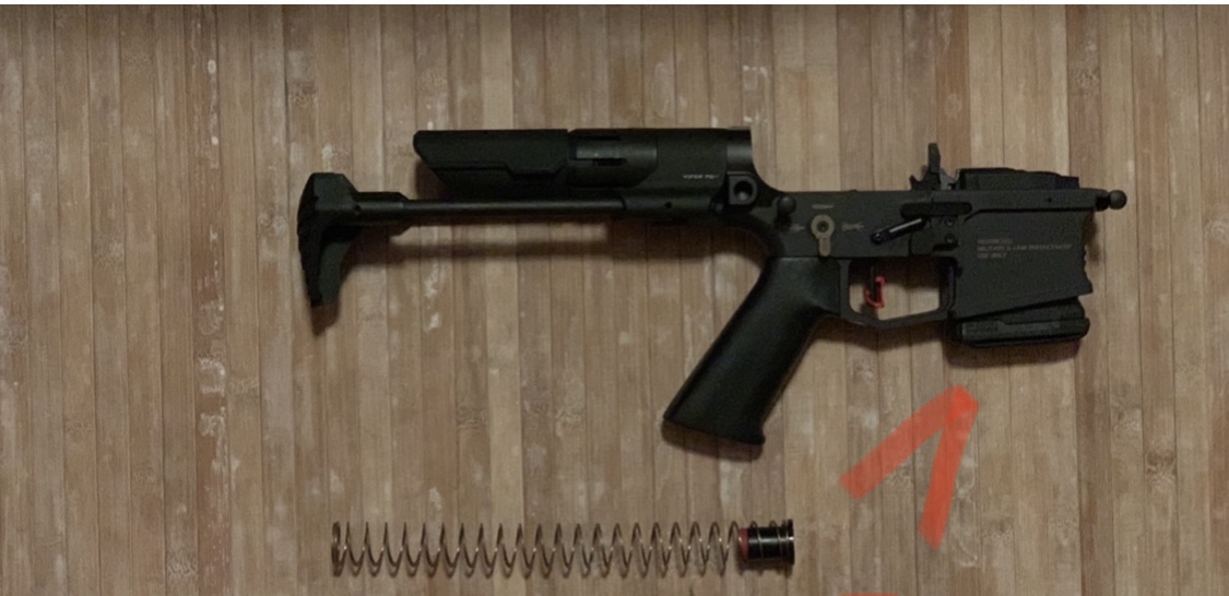 Ejemplo concreto: la instalación de un amortiguador del cierre (buffer) JP Enterprises, con muelle guiado para reducir roces generadores de ruidos y minimizar vibraciones en aras a una mayor precisión, en una culata Strike Viper PDW retráctil de tubo MÁS CORTO que el de serie, sustituyendo su resorte+buffer original (foto 1). El muelle y la guía del JP (foto 2) resultaron demasiado largos para permitir la apertura total del boltcarrier y consiguiente expulsión del casquillo.
