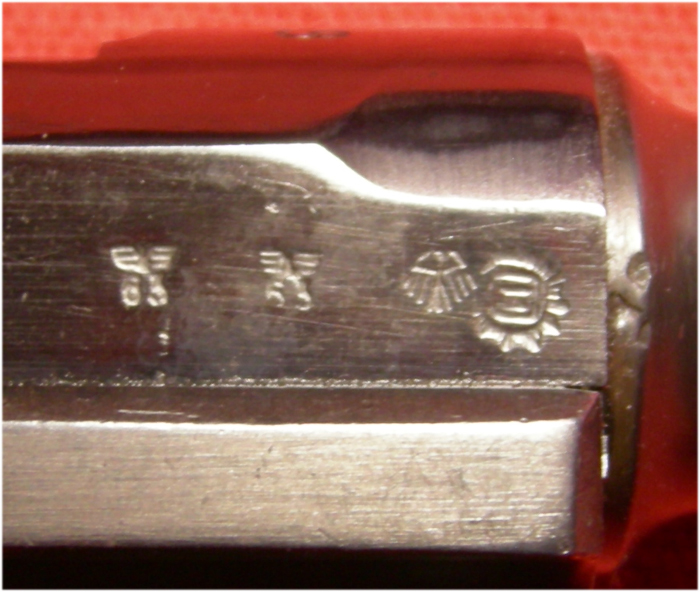 A la derecha de estas marcas vemos el punzón con forma de sol o estrella típico de las armas reutilizadas por la VOPO de la RDA después de la Guerra.