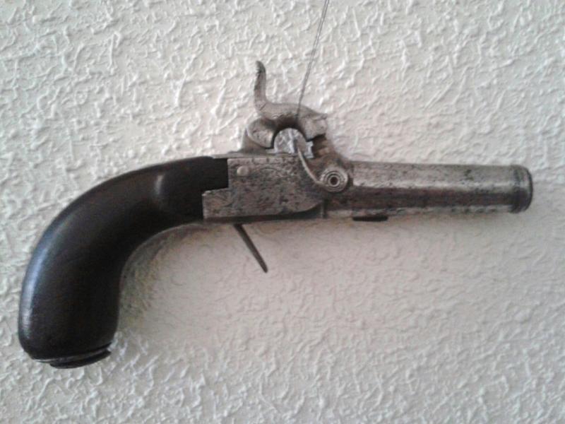 A mi el arma se me va un poco de época para mis gustos pero no creo equivocarme si digo que se trata de una pequeña pistola de bolsillo de las que se conocen como "cachorrillo de pistón".