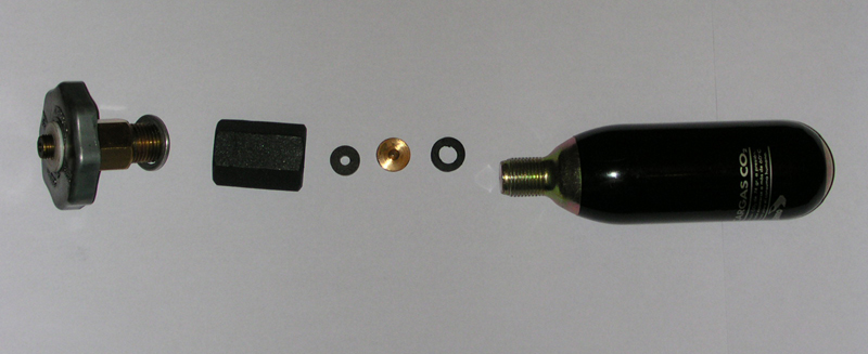 compras el adaptador de co2 de una bombona de 12gr a la rosca de 88gr que vende gamo, buscas un tornero y le pides que transforme la rosca a m10 paso 1 y 5mm de largo, un alojamiento para junta torica en el plano y ya esta.