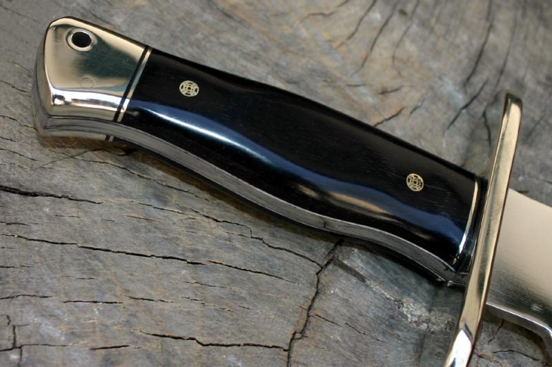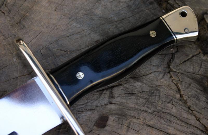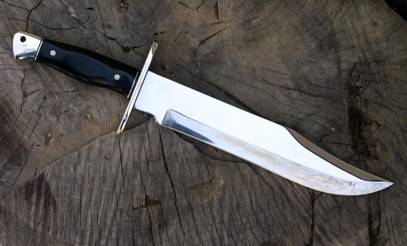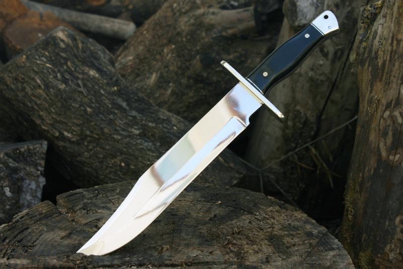 Vendo cuchillo Bowie hecho por encargo, sin uso. Tiene una longitud total de 38 cm., la hoja mide 25,5 cm. (incluido el recazo), y tiene un grosor de 4,5 mm. El peso es aproximadamente de 560 gr. (sin funda). La hoja está pulida a espejo, tiene un vaciado cóncavo y un falso contrafilo.