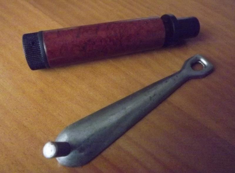 Vendo el lote compuesto de una aceitera + llave para abrir la puerta del cargador originales para rifle K98 o cualquiera de sus clones.
