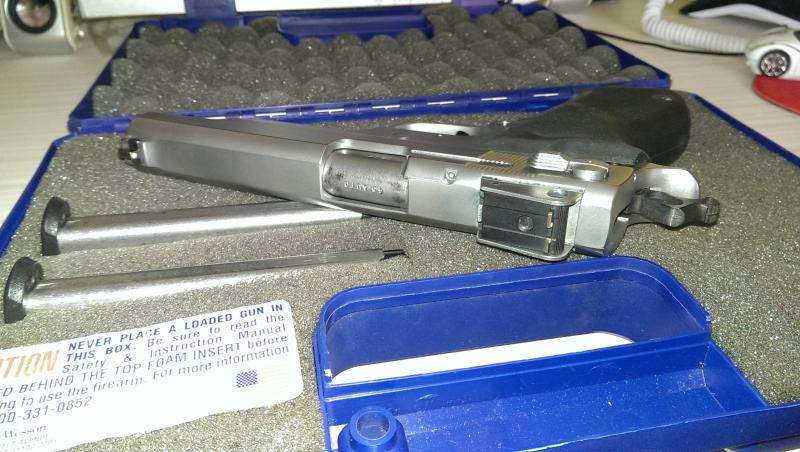 Magnífica arma y a precio de derribo, la verdad.El armazón es el de la versión de 10mm (S&W 1006) y es capaz de aguantar cargas picantes del 45 acp y del 45 super sin inmutarse.