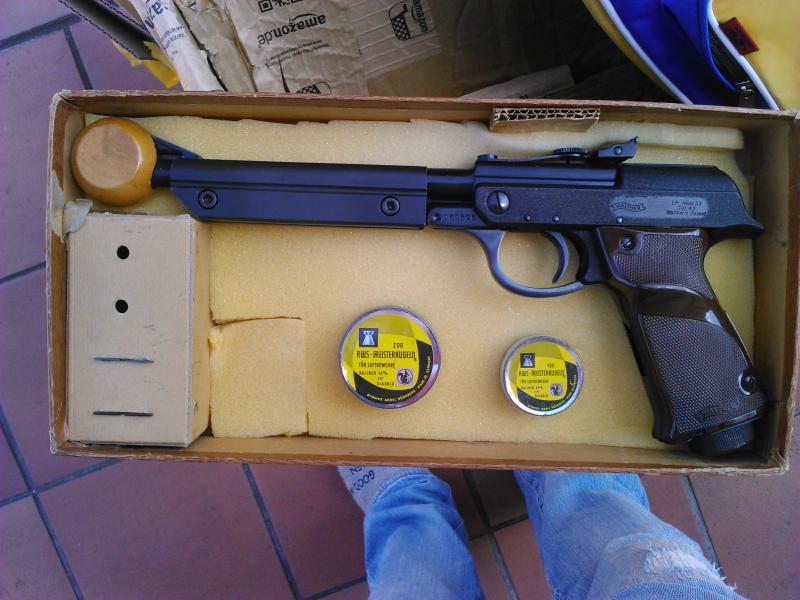 Se vende Walther LP-53 en muy buen estado de conservación. Estado de 9,5/10, lo cual para una pistola de más de 50 años no está nada mal (es de últimos de 1964). Con caja de cartón original Walther, pieza de madera para ayudar a abrir el arma, contrapeso (muy difícil de encontrar), dos viejas latas vacías de balines RWS de 100 y 200 unidades y dos tablones de alza extras además del que lleva puesto. Para estar completa sólamente le faltan dos puntos de mira extra que llevaba originalmente y en algún momento a lo largo del tiempo se extraviaron. Las cachas son de plástico en color marrón oscuro. El pavonado está en muy buen estado, únicamente presenta desgaste en la boca del cañón en los puntos en los que se acopla la pieza de madera de ayuda para la carga. Su funcionamiento es perfecto, tiene mucha fuerza y cuesta bastante abrirla. Este modelo de pistola de aire tiene una historia muy curiosa, ya que se usó en algunos de los carteles promocionales de películas de James Bond protagonizadas por Sean Connery. En la sesión de fotos iban a llevar una Walther PPK al estudio de fotografía, pero alguien se olvidó de hacerlo. Por suerte el fotógrafo encargado de echar las fotos era aficionado al tiro y tenía por allí su LP-53, que fué la que de forma improvisada se utilizó para hacer ese día los retratos. Parece ser que en principio la idea era sustituir en los póster la LP-53 por la PPK, pero es algo que no llegó a hacerse. La pistola original en cuestión (nº 054159) fué subastada el 14 de Febrero de 2.001 en Christie´s y se pagó por ella 20.487 $. El 25 de Noviembre de 2.010 fué de nuevo subastada en el mismo lugar y algún fan de 007 pagó por ella 438.609 $ :shock: . Esta que yo pongo a la venta está igual de bien (el pavonado está incluso mejor) que la famosa pistola de 007, pero algo más barata :lol: : 350 euros.
