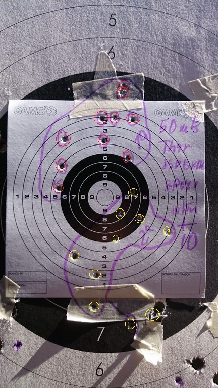 Aunque hice la diana con la Cometa en el mejor momento mio, sólo pude hacer dos tandas de 10 tiros, pues luego se me bloqueó ( por enésima vez) el gatillo y ya no pude seguir. Creo que se pueden mejorar.