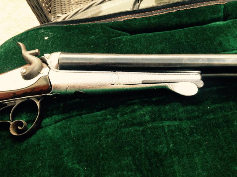 Yo participo en el foro de avancarga, pero sí, esa escopeta tiene un cierre Lefaucheux, que es menos robusto que el cierre en "T" inglés con palanca bajo el guardamonte, de los primeros modelos de fuego central. Los punzones de los cañones son de Saint Etienne, franceses. O bien es una transformación del sistema Lefaucheux (para cartuchos de espiga) a cartucho de fuego central, o es de las primeras de fuego central si salió así de fábrica. En todo caso sólo se puede cargar con pólvora negra. Con pólvora negra suiza actual no cargar más de 45 grains (3 gramos de FF) y 26 a 28 gramos de perdigón (una onza), y eso en el caso de que los cañones, la báscula y el cierre estén en buenas condiciones.