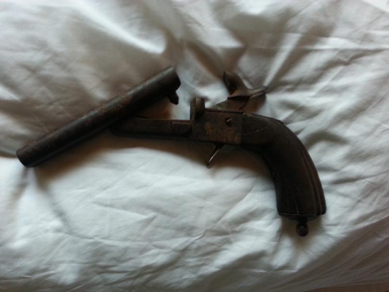 Parece que es una pistola de dos cañones del sistema Lefaucheux, era un modelo muy común en España a finales del XIX e incluso principios del XX ...