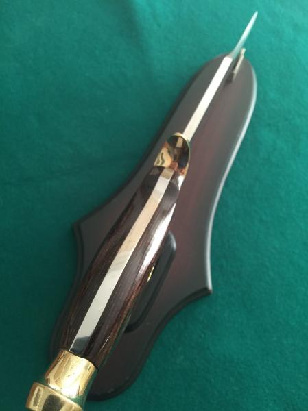 Se trata del BOWIE MUELA 24E de 1981, con cachas de madera fijadas mediante dos generosos pasadores de latón, medallón dorado, ENTERIZO (nada que ver con los de espiga, posteriores), con "finger grips" (separaciones interdigitales), guarda y pomo de latón macizo, y 24,5 cm. de hoja con un grosor de 6 mm (los actuales, de espiga, tienen un grosor de 4,5 mm).