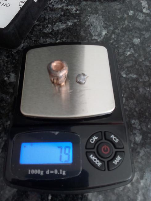 En concreto se recuperaron 7,3 gramos de parte trasera y camisa + 0,6 gramos de plomo = 7,9 gramos recuperados de los 11, 6 gramos originales, es decir, un 68,10% de peso retenido DESPUES DE ATRAVESAR EL PRIMER BLOQUE Y EL LIBRO GORDO.