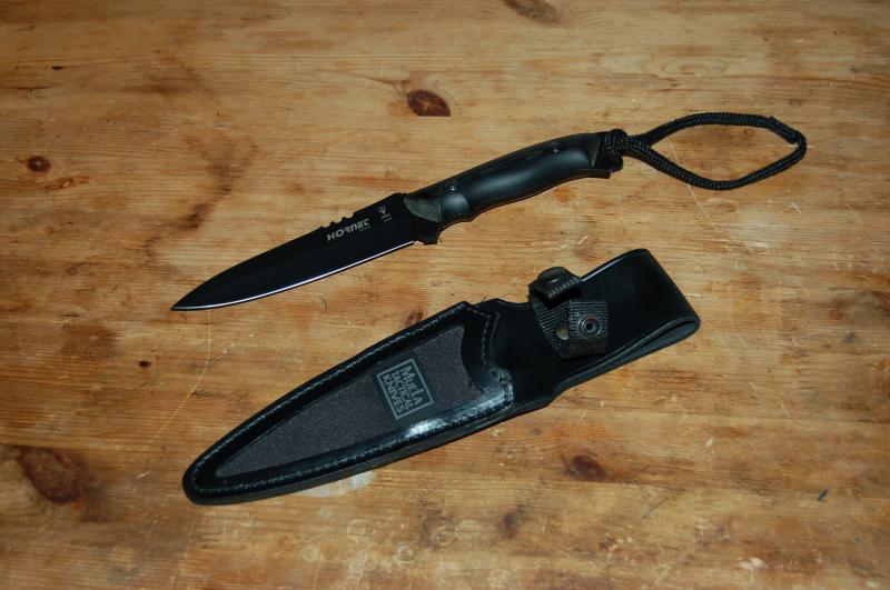 Cuchillo Muela Hornet, tipo semidaga, con hoja de 15 cm y acabado en negro. Funda modificada para que el cuchillo no baile (era un defecto de las fundas de este grupo: había holgura y hacían ruido; con la modificación, no lo hace y queda prieto). NO TIENE USO. Filo original, nuevo. Portes aparte (2.5 euros por ASMgo).