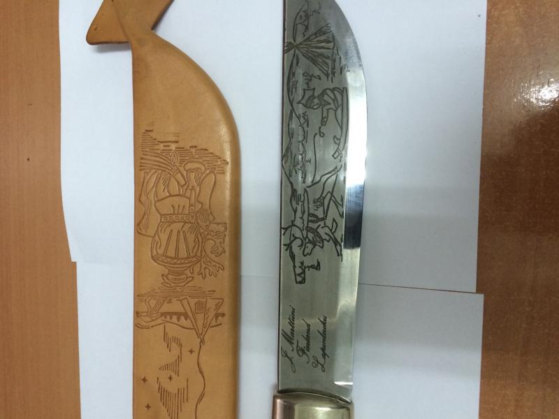 Vendo un magnífico cuchillo de coleccionista, fabricado en Finlandia con acero de alta calidad,fabricado a mano,la empuñadura es de madera de raíz,la hoja está grabada y el filo está afilado con láser,es capaz de cortar un papel de un solo movimiento suave,tiene grabado unos bonitos motivos esquimales, la funda está realizada en auténtico cuero,la funda como se puede ver en las fotos también está grabadas con los mismos motivos que la hoja, nunca se a usado por que pertenecía a una colección privada