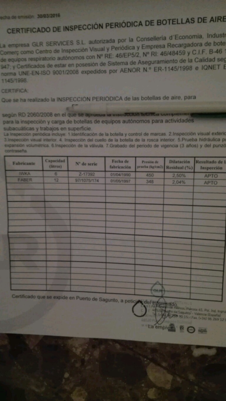 Tiene el retimbrado recien pasado a fecha de marzo de 2016, valido hasta marzo de 2019 y la revisión visual pasada en marzo de 2016 y valida hasta marzo de 2017.
