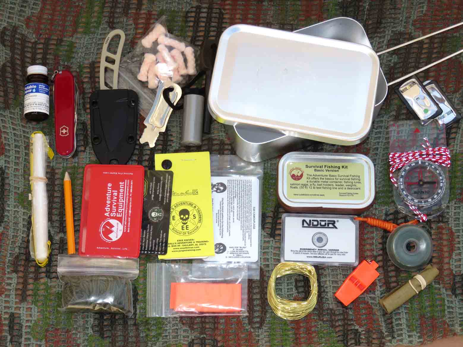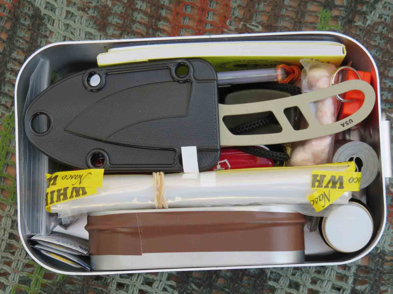 Incluye: cuchillo con funda, brujula, espejo señales, kit de pesca, potabilizador agua y muchas más piezas que lo hacen extremadamente útil. Va en una caja metàl·lica semiaestanca que facilita su transporte y possible uso.