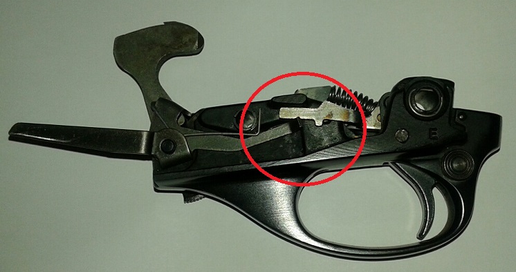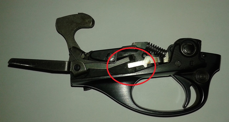 El fiador tiene un muelle que algunos espabilados aflojan para que el peso del disparador sea menor y resulte más cómodo.