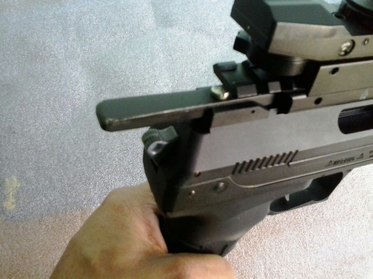 Hola, aqui la pistola sin el red dot y preparada para marchar, como veis, esta como nueva, el red dot lleva pila de repuesto.