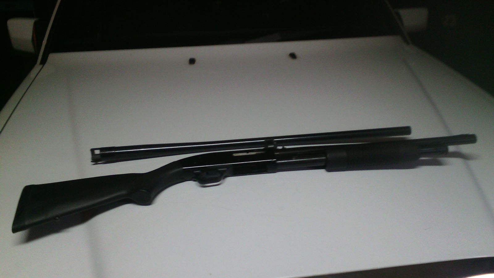 Se trata de una Mossberg 500 de repetición (por mecanismo de corredera) en polímero negro con 2 cañones intercambiables, el de más corto con alza y punto y el largo con banda de puntería típica de escopeta para cartuchos con perdigones. Capacidad de 5 cartuchos en el tubo alimentador + 1 en la recámara.