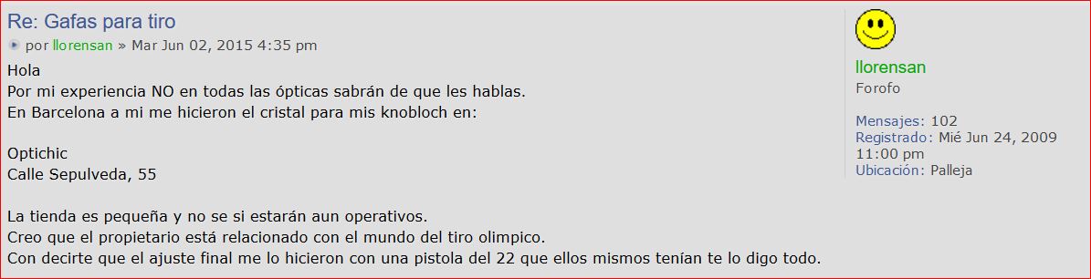 Me acabo de comprar unas gafas knobloch y me gustaría saber dónde puedo ir a graduarlas,hace tiempo leí en este foro que había alguna óptica en Barcelona que el dueño también es tirador y lo hacían bien,pero no consigo encontrarlo, soy de Vilanova i la Geltrú,si alguien conoce alguna óptica cerca de donde vivo,se lo agradecería