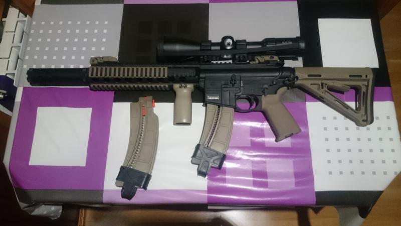 Al completo gasté algo más de 1500 euros y la vendo al completo con 2 cargadores con agarre, empuñadura magpul, mira telescópica de encare rápido con dos tonos de color noche y día de la retícula, Avistar 2.5_ 10 x 50 con anillas UTG de agarre rápido, un punto rojo/ verde de 1X 40mm con anilla de agarre rápido, un simulador silenciador protector de cañón comprado en EEUU, más una funda de camuflaje para el arma con 5 bolsillos para cargadores.