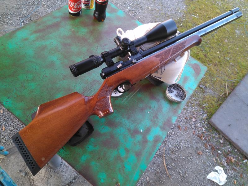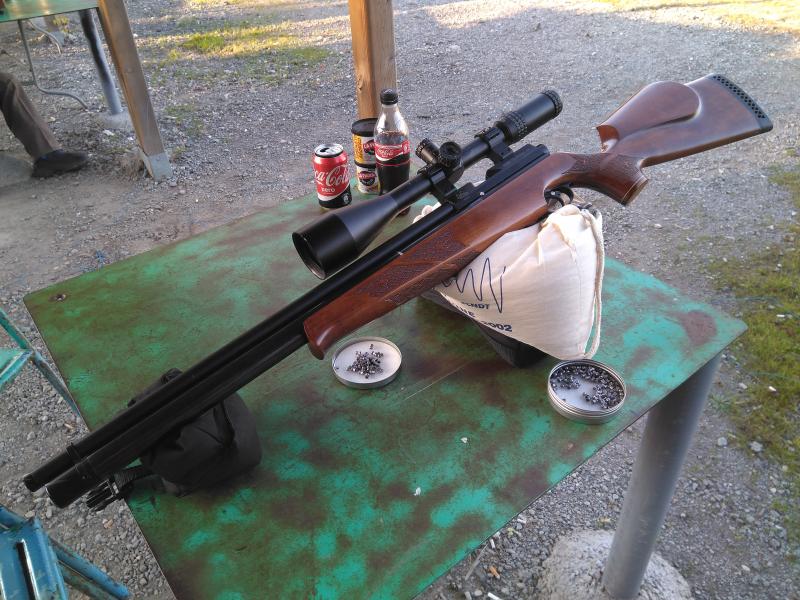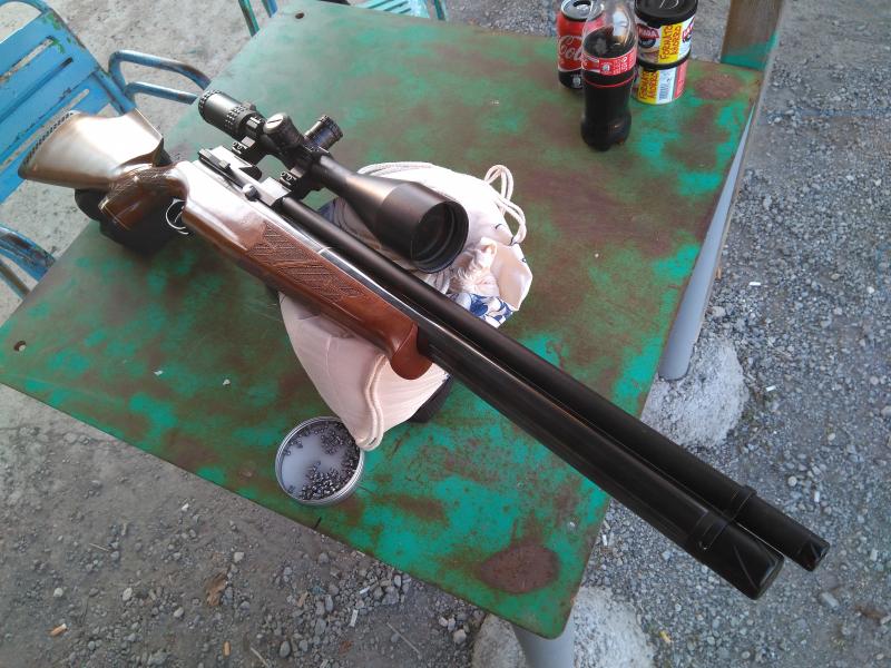 Lleva un alargador de deposito hecho con otro deposito de air arms y un machon macho macho hecho por un tornero en inoxidable, en este alargador se puso un regulador de presion lobo mkI dentro. Cañon enfundado que la silencia bastante, opcionalmemte se le puede enrroscar otro silenciador en la punta de la funda con lo que queda practicamente muda.
