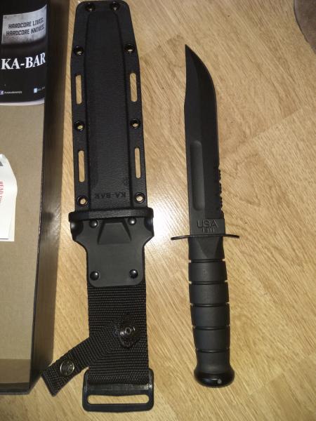 Buenas tardes, se vende cuchillo Ka-Bar modelo 1214 con hoja de acero carbono 1095, con filo parcialmente serrado, longitud de la hoja 17,78, longitud total 30,48. Hecho en USA. Empuñadura sintética antideslizante con pomo de acero. Funda de Kydex con cierre a presión y cierre de clip.Totalmente nuevo, en su caja