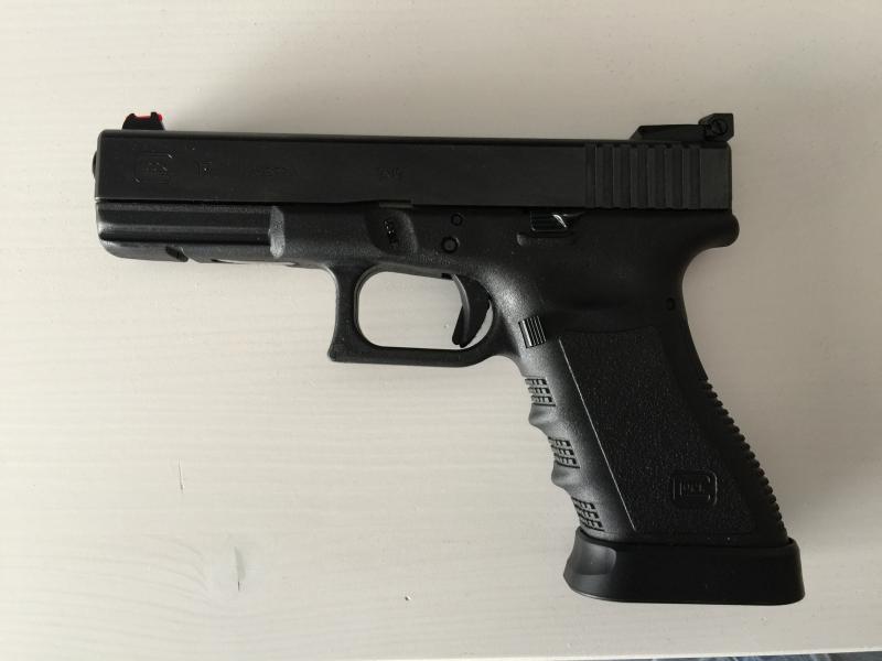 Glock17 3GEN con muy poco uso. Conjunto alza y ounto de mira LPA, toma del cargador y palanca de retenida sobredimensionadas, muelle recuperador DPM y 4 cargadores.