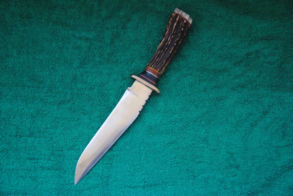 Acero d2 19 cm. de hoja por 3,5 cm y 6 mm de grosor. Guarda sencilla de laton,ebano, coral y un precioso sambar con tapa de ciervo espero que os guste.