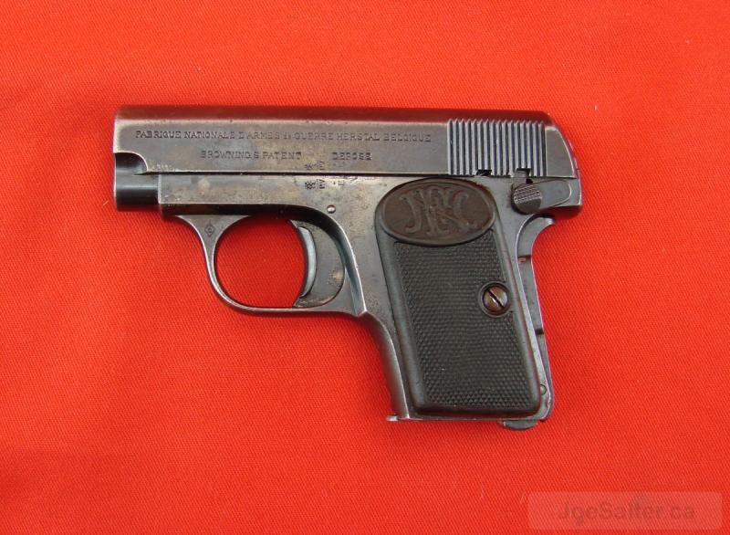 Esa pistola, parece una copia de la FN Baby Browning en 6,35 (25 ACP), de las que existen varios modelos, con ligeros cambios mecánicos en el tiempo (modelo 1905, 1906, 1908, etc), pero con la foto esa solo, poco mas se puede discernir, y la palanca del seguro, parece un adorno, pues no se ve donde pueda encajar en la corredera, para hacer su función, como en el modelo original.
