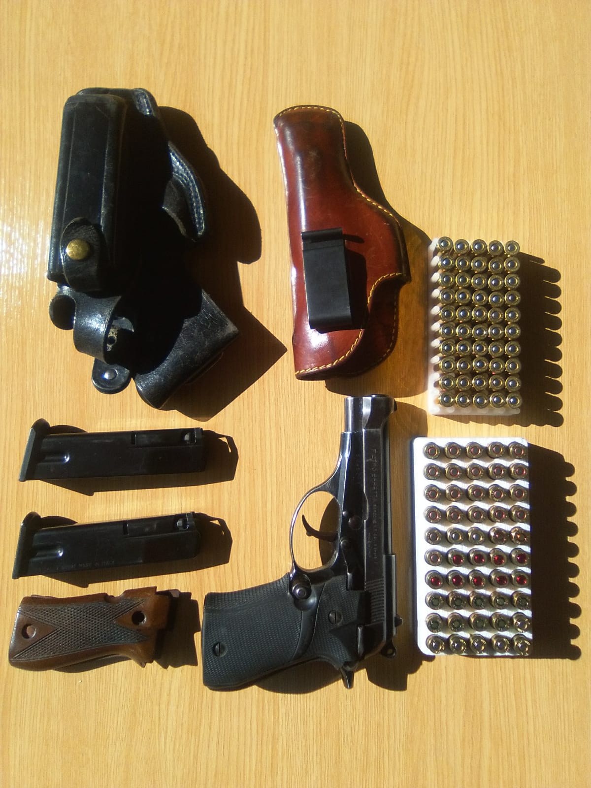 Un amigo tiene en venta esta pistola: marca Beretta de 9 corto ,14 disparos,dos cargadores,cachas de madera,fundas.