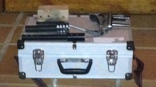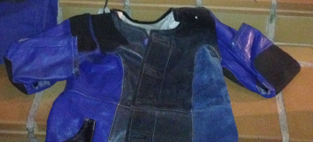 Chaqueta de tiro y maletín con diversos accesorios.