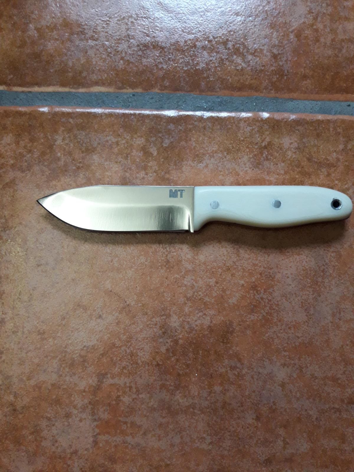 Cuchillo de supervivencia y bushcraft fabricado por Manuel de la Torre, en acero Bohler N690Co y cachas de micarta blanca. Fina de cuero.