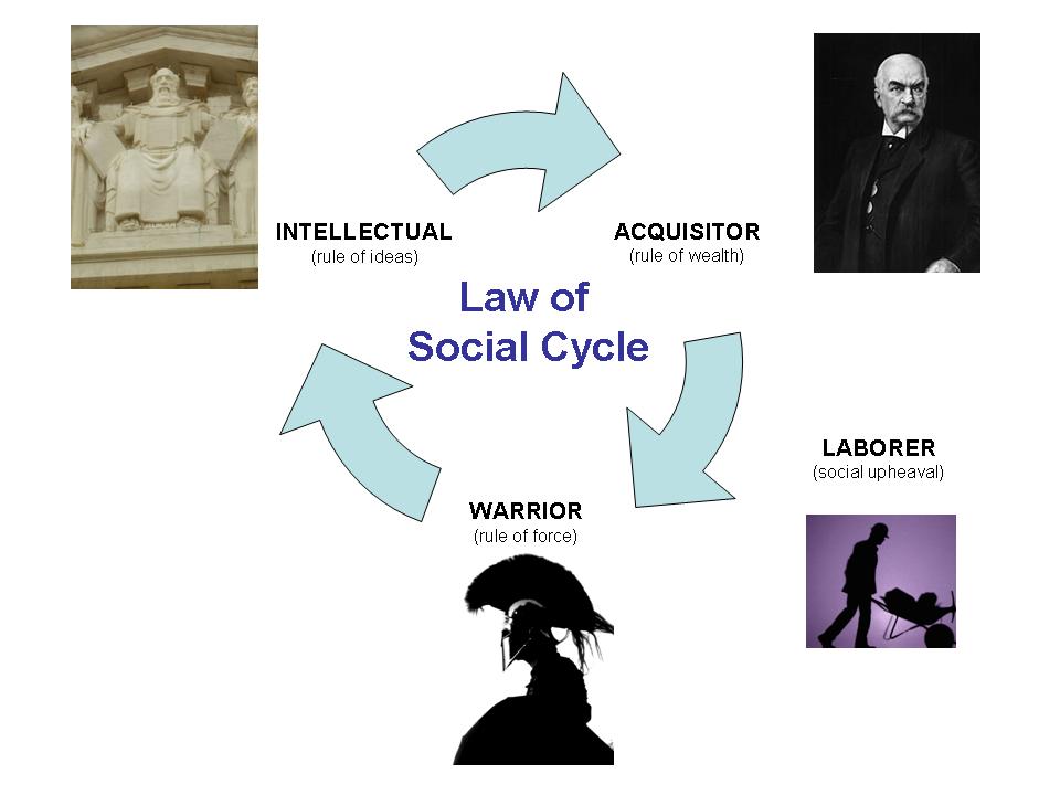 La "era de los guerreros", que trae un orden estricto a la sociedad y un retorno a los valores fundamentales, conduce esencialmente a una excesiva concentración en el dominio del hombre fuerte y la guerra. Le sigue una "era de los intelectuales", que traen un sentido de liberación en la esfera mental, pero pronto reemplazan esa libertad por el yugo de ideas más nuevas. Con el paso del tiempo, esta era se funde en una "era de los adquirentes", que trae progreso en el ámbito material, pero pronto se sustituye por una mayor explotación física y mental. Las Guerras de los Serviles significaron la perdición de la República Romana. Según esta teoría, el conflicto laboral podría ser la ruina del capitalismo. Y así el ciclo se mueve en su vuelta sin fin, hasta que la civilización deja de existir o es asumida por una civilización superior o más poderosa.