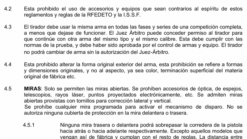 Al punto 4.4 del apartado EQUIPOS Y MUNICIONES del Reglamento Técnico Oficial de Pistola 9mm RFEDETO 1/01/2018, me remito.