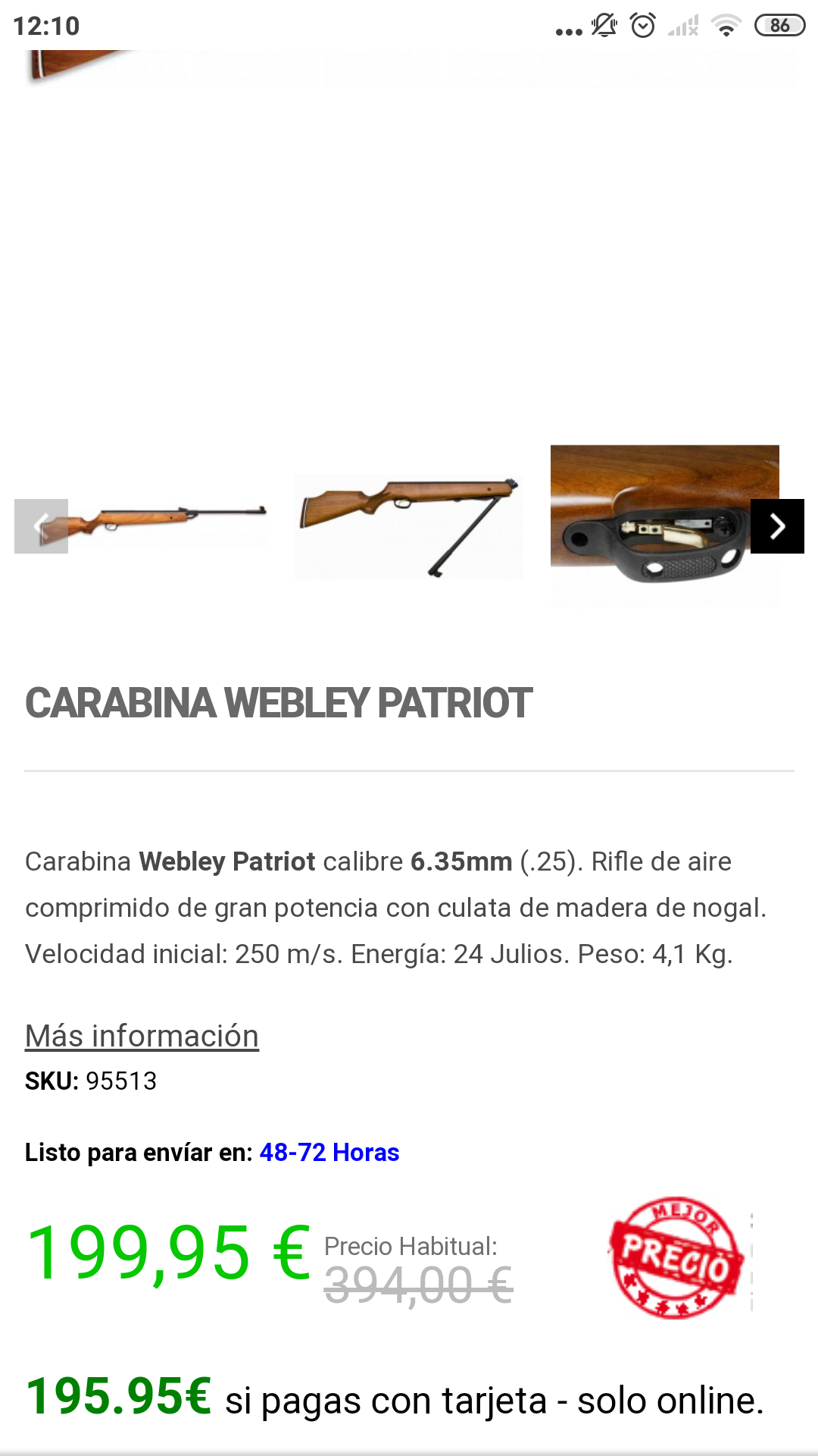 No me mentéis la Patriot, que me entra la nostalgia. Tuve una en calibre 5.5 durante bastantes años. La buena, de Webley & Scott - Birmingham.. pero eran 4,3 kg sin visor, 124cm de largo y cañón muy pesado con lo que el centro de gravedad se iba para adelante y aun notabas más el peso. Por añadidura, te dejaba el brazo hecho polvo al quebrar el cañón unas cuantas veces. Un servidor ya no podía con ella, así que, sintiéndolo muy mucho, me deshice de ella por poco dinero. Como pieza de colección estaba devaluada por marcas en la madera y el metal algo oxidado. Además, venderla legalmente era difícil por problemas digamos de algún que otro agosto de más.