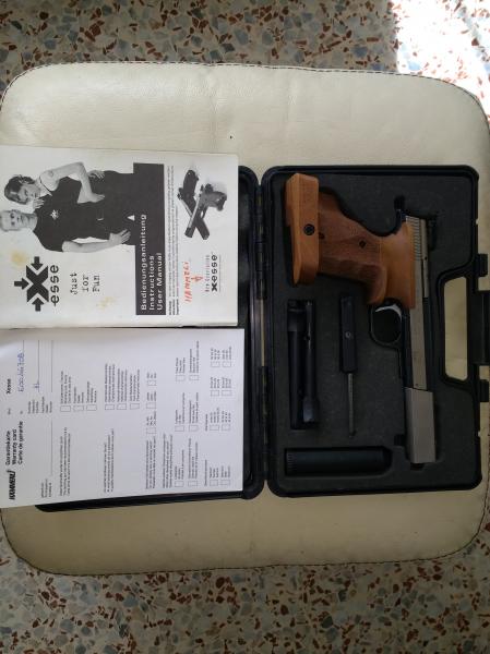 La pistola es la Suiza, está mejorada con contrapeso de 160 gramos, cacha anatómica Nill, talla M (nueva). Cola de disparador metálica. Regulador de peso del segundo tiempo y muelle recuperador de corredera nuevo (de repuesto). El que tiene montado es más corto para munición más suave. 3 cargadores .Precio 450 € más portes. El arma se encuentra en La Línea (Cádiz)