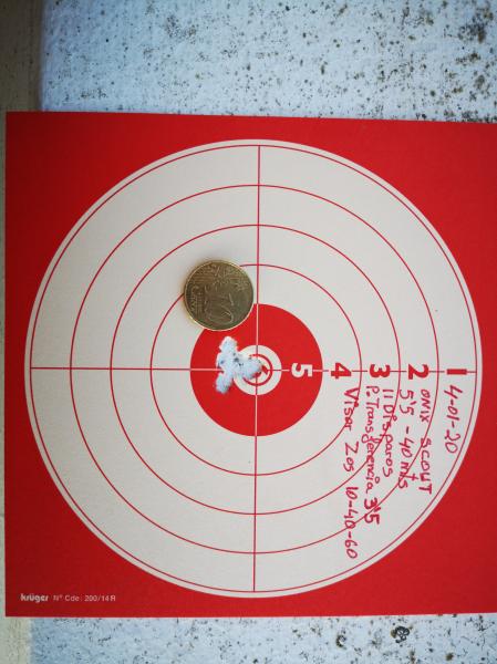 Buenos días.Hoy tocó probar la Scout con puerto de transferencia a 3,5 (que para mí es la apertura que mejor le va)a distancia de 40mts.cal.5,5 ,11 disparos, visor Zos 10x40x60 y la munición,JSB EXACT JUMBO HEAVY 18,13 grains.Os dejo un par de fotos.Saludos.