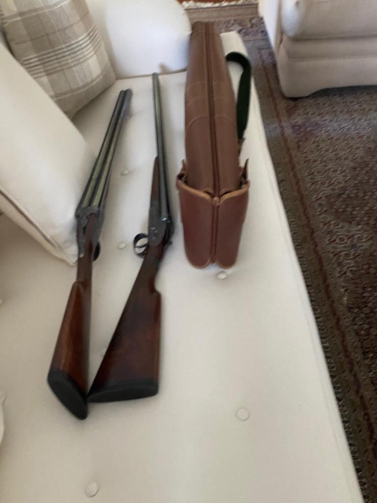 Escopetas gemelas de gran calidad, con funda doble de piel en perfecto estado.