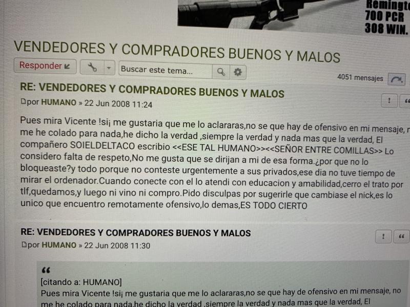 me buscas una historia de 2008 que ademas ni me acordaba porque he estado fuera del foro mas de diez años y de lo que se quejan es de no contactar conmigo pero sin pronblemas,tienes que estar muy jodido por haber perdido la compra de la carabina,que segun tu solo le traera problemas al comprador y te olvidas de los comentarios a favor que son varios