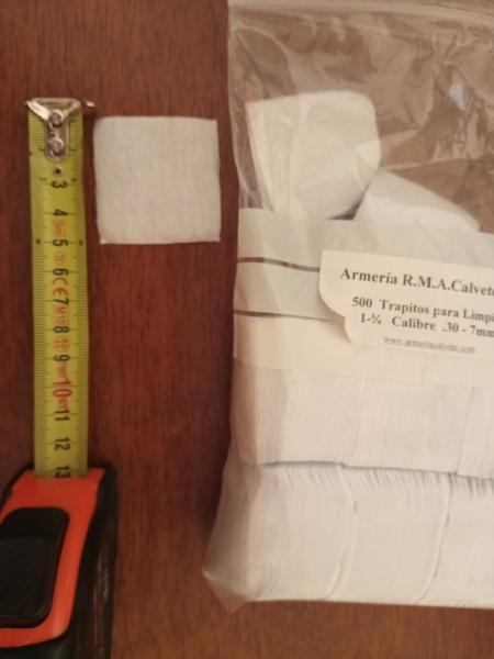 Trapos. Yo uso los de Sinclair. Éste tamaño para del 6,5 en adelante. Para el .22 lr son más pequeños.