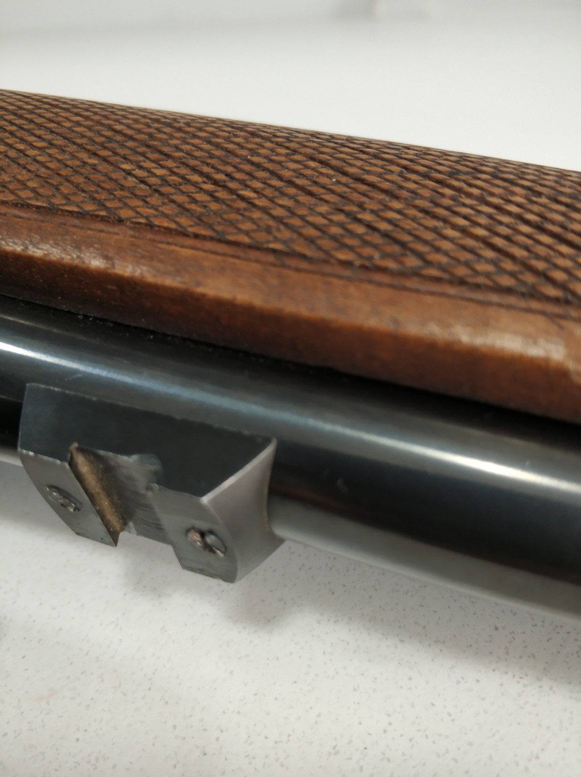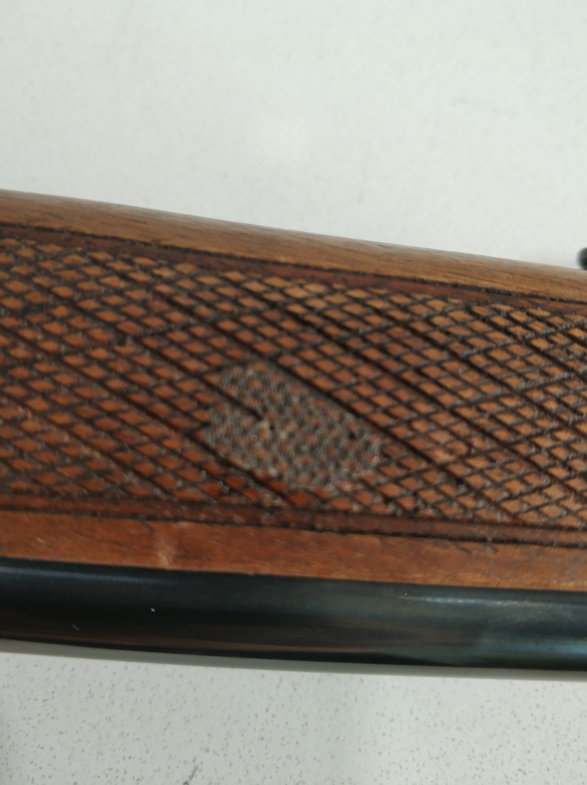 Tiene marcas de uso, y la madera necesita un repaso (ver fotos), pero tiene veta. Le falta el tablón del alza (se lo debieron quitar para montar más bajo el visor).