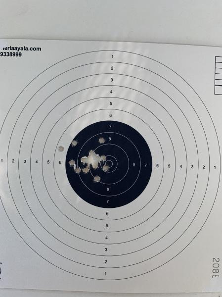 Ahora acabo de hacer una serie de 20 tiros, solamente a 25 metros sobre una diana de las que se usan para pistola aire 10 metros, muy complicado resulta, el negro casi no lo veo, además el tablón del alza se ve mucho mas ancho que la diana y casi no se pueden tomar referencias correctas.